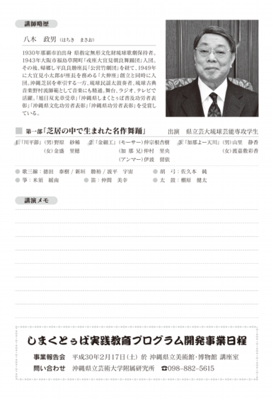 ウチナー芝居の名優・八木政男氏による講演と芝居の上演を通して、芝居の喜怒哀楽や芝居の裏話等「しまくとぅば」でしか伝える事の出来ない言葉を受け継ぎます。