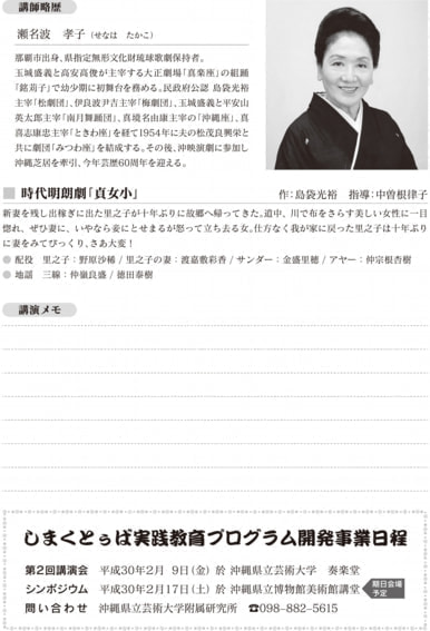 ウチナー芝居の名優による講演と芝居の上演を通して、芝居の喜怒哀楽や芝居の裏話等「しまくとぅば」でしか伝える事の出来ない言葉を受け継ぎます。
