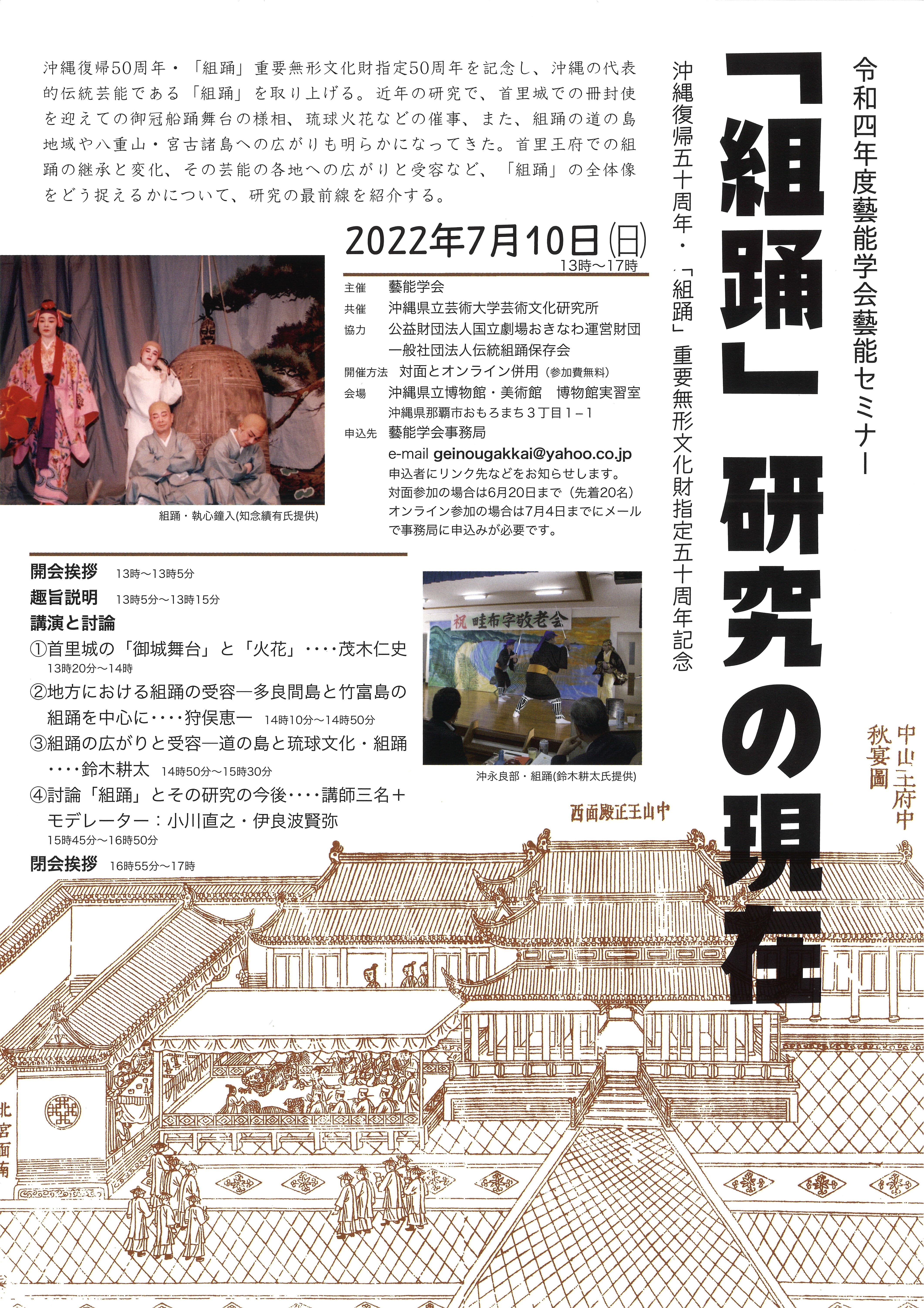 藝能学会が主催する藝能セミナー「「組踊」研究の現在」が2022年7月10日(日)に開催されます。