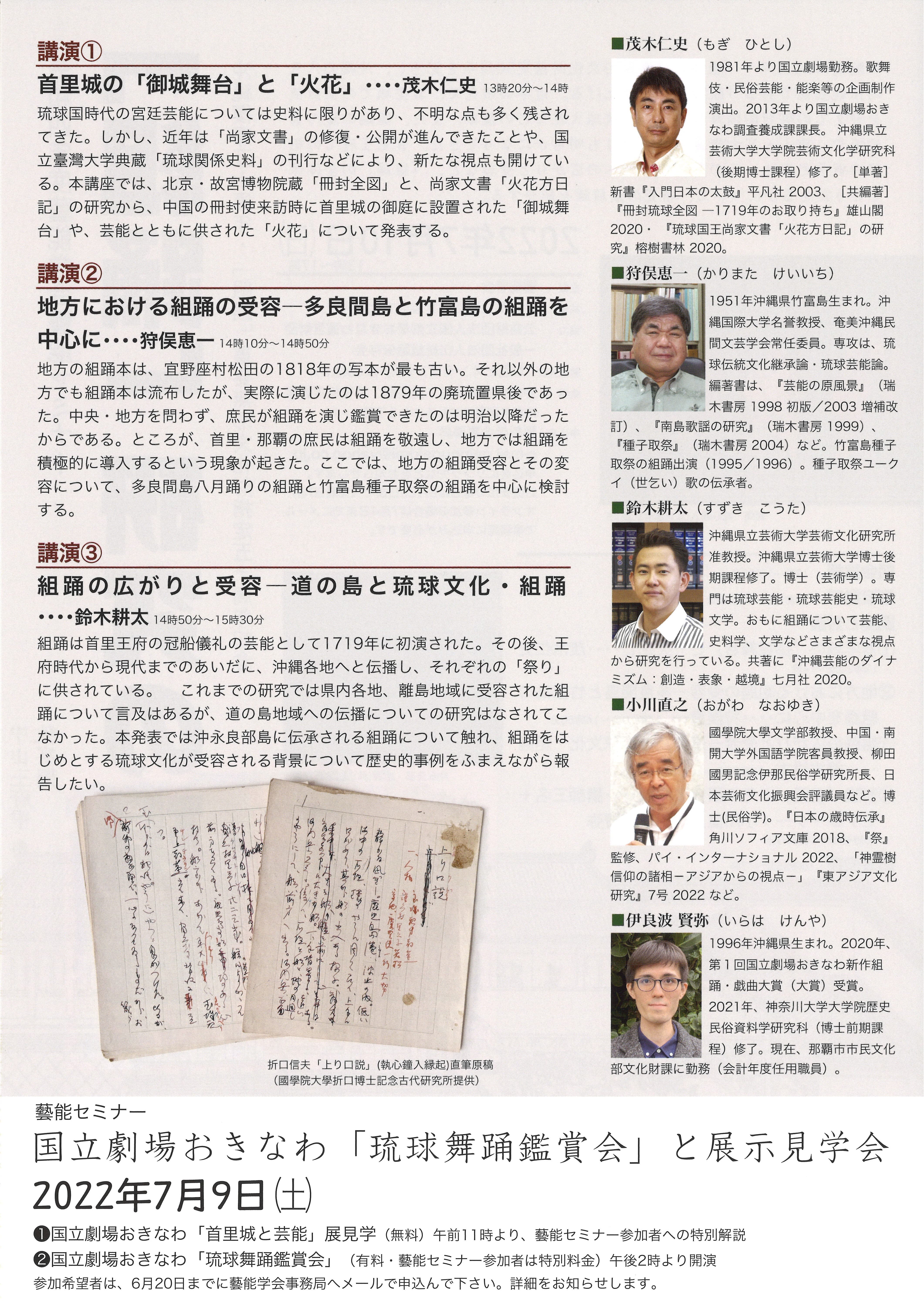 ご参加をご希望の方は、チラシをご確認の上、藝能学会事務局までお申し込みください。