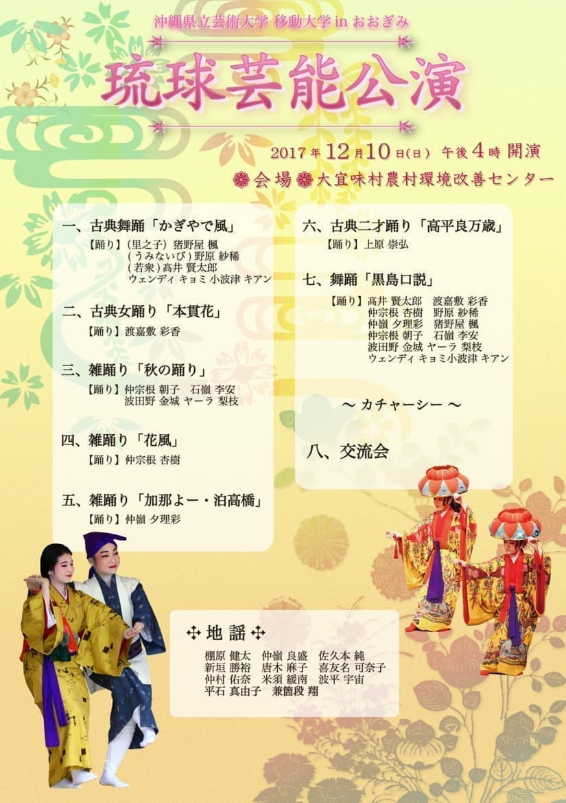 12月23日(火)24日(水)、平成26年度移動大学が伊良部島にて開催されました。14講座開講し、受講人数は総計650名。夜間公演は、23日に佐良浜中学校にて空手道演武・洋楽コンサート、24日は伊良部公民館にて伊良部島伝統芸能・琉球芸能公演を行い、約290名の方にご来場いただきました。どうもありがとうございました。