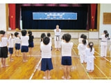 芸大講師・学生が那覇空港を出発し宮古空港へ。宮古島平良港からフェリーで乗り継ぎ伊良部島佐良浜港へ。バスにて約10分ほどで佐良浜小学校に到着!この後すぐ、旅の荷物を控室に預け、各教室の準備をし開講式を行いました。(画像:佐良浜小学校校庭)